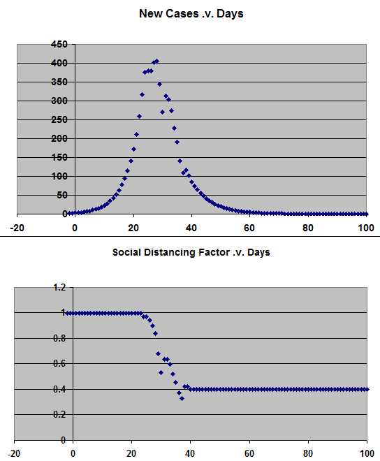 Since the situation with CV-19 is chancing so fast I have updated my model to a daily calculation. I have also have changed the parameters. For Australian data I assume the infection lasts for 9 days and until March 25th (which corresponds to day 25 in the graphs) little was being done. After that I allow for 3/4 of the cases to be detected and isolated after 4 days, with 1/4 asymptomatic and in the community (1/2, 1/2 for March 26). I then alter the Social Distancing Factor (SDF) to roughly match the Australian data, results for New Cases and SDF below. The bumps up, or surges, in New Cases and the SDF occur over 4-6 days after a Friday. With an incubation time of ~4 days this correlates with people being more ‘friendly’ on Friday-Sunday. Stop it, you are not helping! For the Australian data, extrapolating into the future gives me <1 case by May 10, which seems rather optimistic. But, if this is indeed the case, we should keep on doing what we are doing and not relax prematurely.