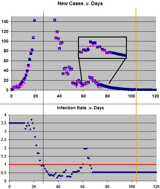 Hopefully my last update since Australia is doing really well and provided the politicians and we (the public) do not ‘drop the ball’ we are on the way out. The new case numbers are now becoming ‘noisy’ (which accounts for the large changes in infection rate) and can mostly be tracked to known causes. In the graphs below the vertical black line is our peak, the orange line is when new cases are less than 1 (11 June). However, we need to be vigilant until early July if we want to eradicate it locally. The insert shows new cases (pink) with a 5 day moving average. Blue is my model.